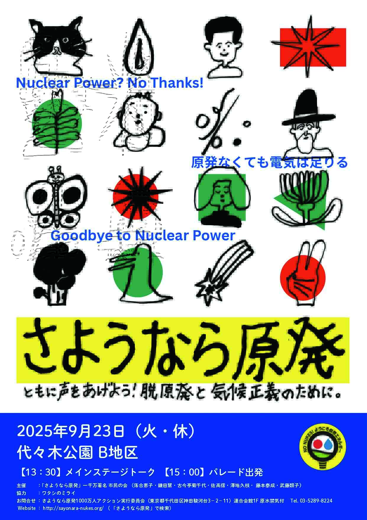 さようなら原発9・23全国集会が9月23日、代々木公園B地区で開催されます。