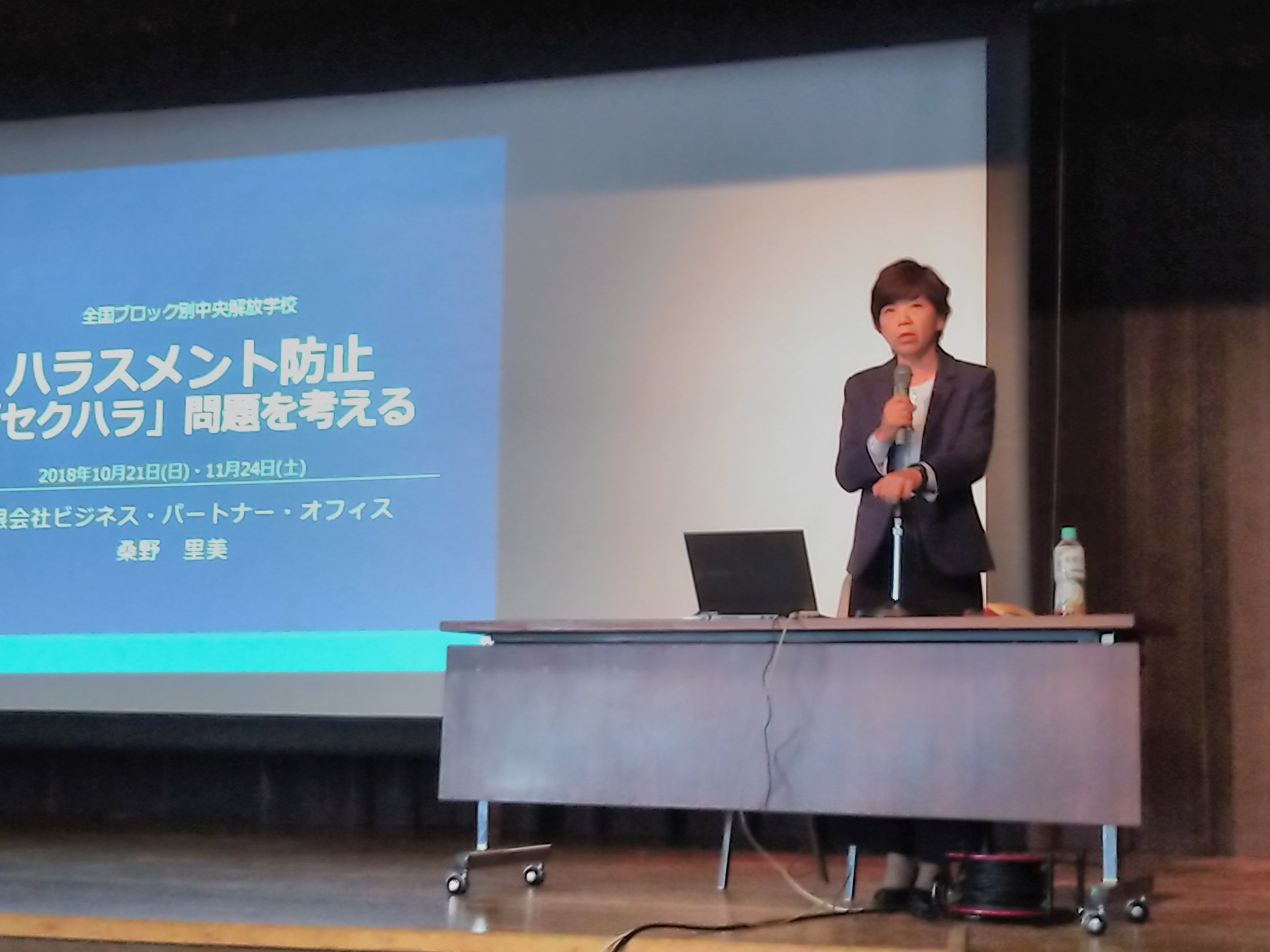 第3講は、一番目として、社会保険労務士・(有)ビジネス・パートナー・オフィス代表の桑野さんより、「ハラスメント防止」にむけたお話をいただいた。ハラスメントには、セクハラ、パワハラ、LGBTハラスメント、マタハラ、パタハラ、ケアハラなどがある。相談を受けるにあたって、相談者の「いやだ」という気持ちにどこまで寄り添えるかが重要だと話された。また、2番目として、山崎中央執行委員より、「男女平等社会実現基本方針(第2次改訂)」の説明と具体化に向けた提起がなされた。