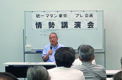 統一マダン東京実行委員会は、2025年7月13日、ふらっとにっぽりにおいて、11月に開催される統一マダン東京のプレ企画として情勢講演会を開催した。「韓日条約60年、その問題点と今後の韓日関係」と題して、在日韓国民主統一連合(韓統連)の孫亭根(ソン・ヒョングン)議長が講演を行った。