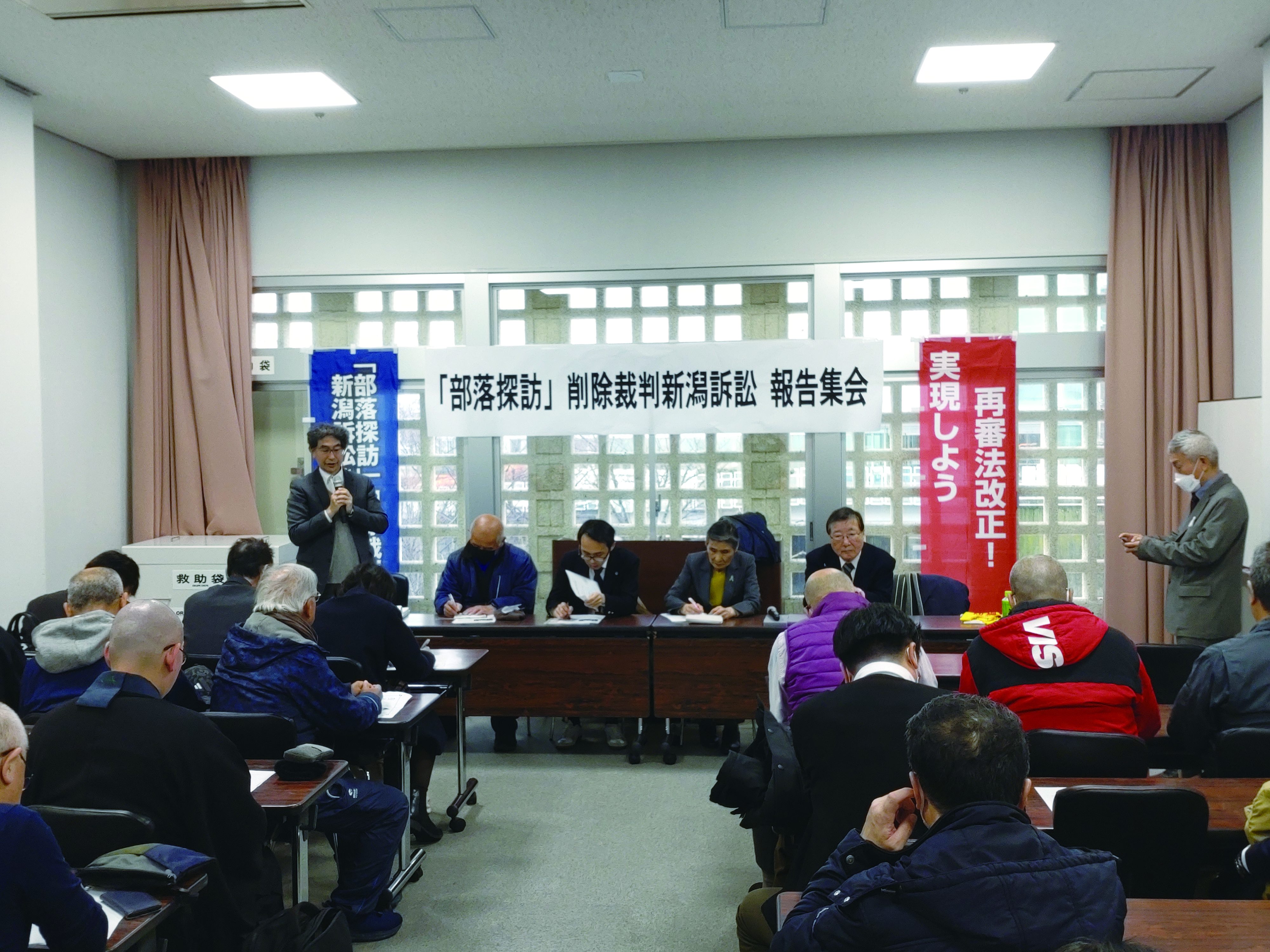 第4回口頭弁論は昨年12月10日に行われた。報告集会は新潟県連の長谷川均委員長の司会ですすめられた。河村健夫弁護団長は「今回は被告が準備書面と関連する証拠書類を出した。新潟県連を誹謗中傷する記事に関するものである。裁判官は双方に次回期日の3月までに、証人尋問申請や関連する証拠書類などをできる限りすべて出してほしいと述べた。裁判は証人尋問をめぐって大詰めを迎えている」と述べた。