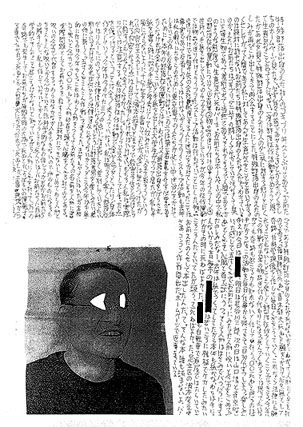 今回の手紙には、浦本誉至史さんの顔写真が、両目をくり抜かれた形で添付されています。これは2003年12月20日の東京新聞朝刊の切り抜きコピーしたものでした。この新聞記事は浦本さんが『江戸・東京の被差別部落の歴史』(明石書店)の著者として紹介されたものでした。「再開宣言」の中で、犯人は、「足立区の浦本誉至史、お前はえたのくせして本出したんだって。そんな本誰も読まないよ。バーカ」とわざわざ述べています。