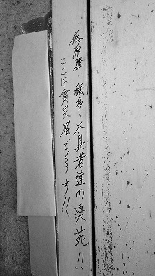 これに対して都連から自治会長が発見してから公社巡回管理人に報告されるまで2カ月以上が経過しており、長期間放置した問題があること。また自治会長のヒアリングで新宿区内都営住宅差別落書き事件を受けて昨年12月の「すまいのひろば」で人権記事が掲載されたが「読んだが忘れていた」と述べていることに課題があると指摘した。また事件に対する見解を明らかにすることを求めた。都市整備局は「都営住宅で年度内に2件発生しており、内容も悪質、卑劣な落書きであり残念である」と述べた。
