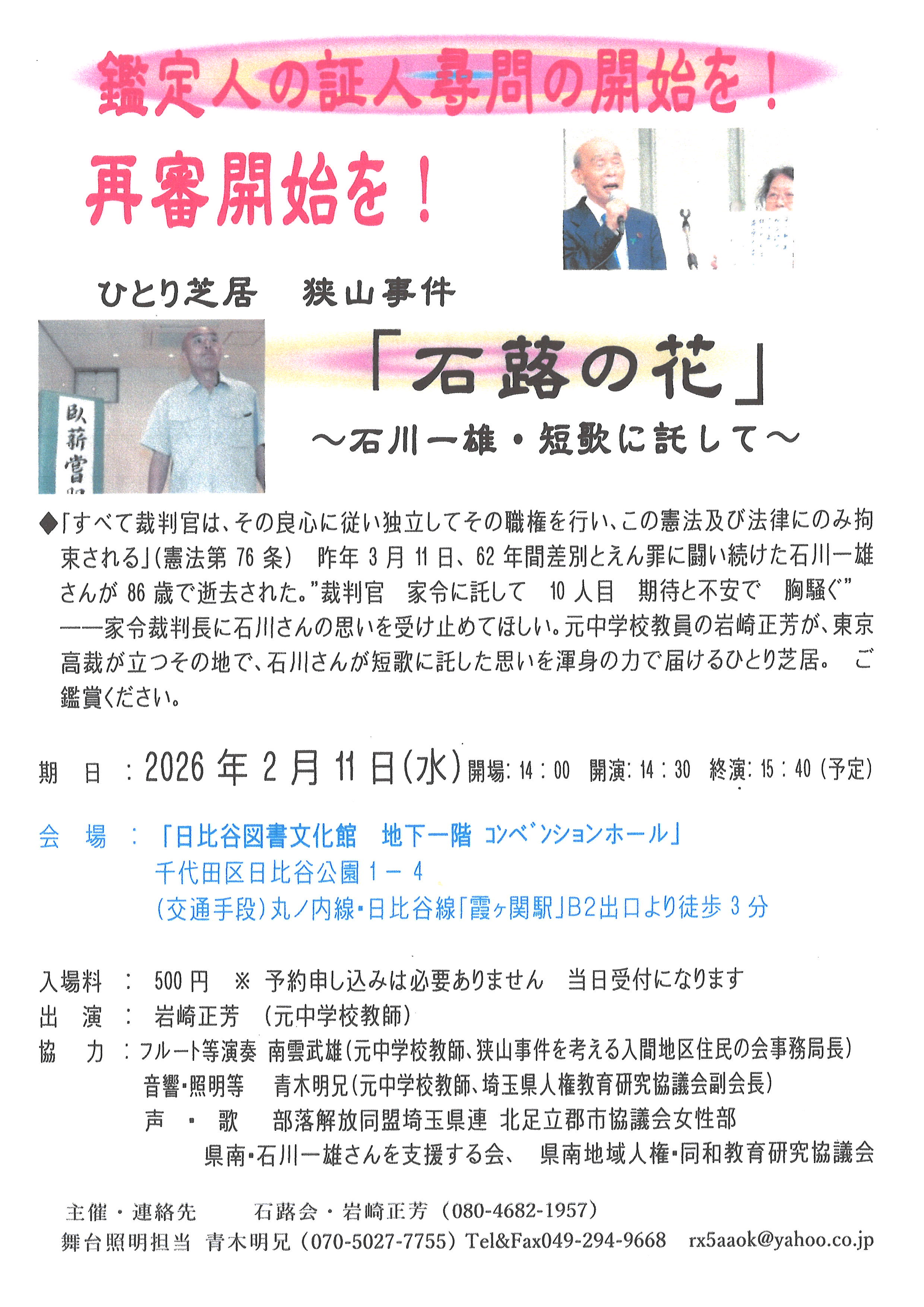 元中学校教員の岩崎正芳さんが、東京高裁が立つその地で、石川さんが短歌に託した思いを渾身の力で届けるひとり芝居。ご鑑賞ください。