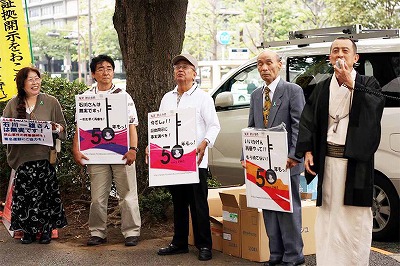 東京都連をはじめ埼玉県連や同和問題にとりくむ宗教教団連帯会議などから十数名が早朝8時30分から高裁前でビラや署名活動を行なった。