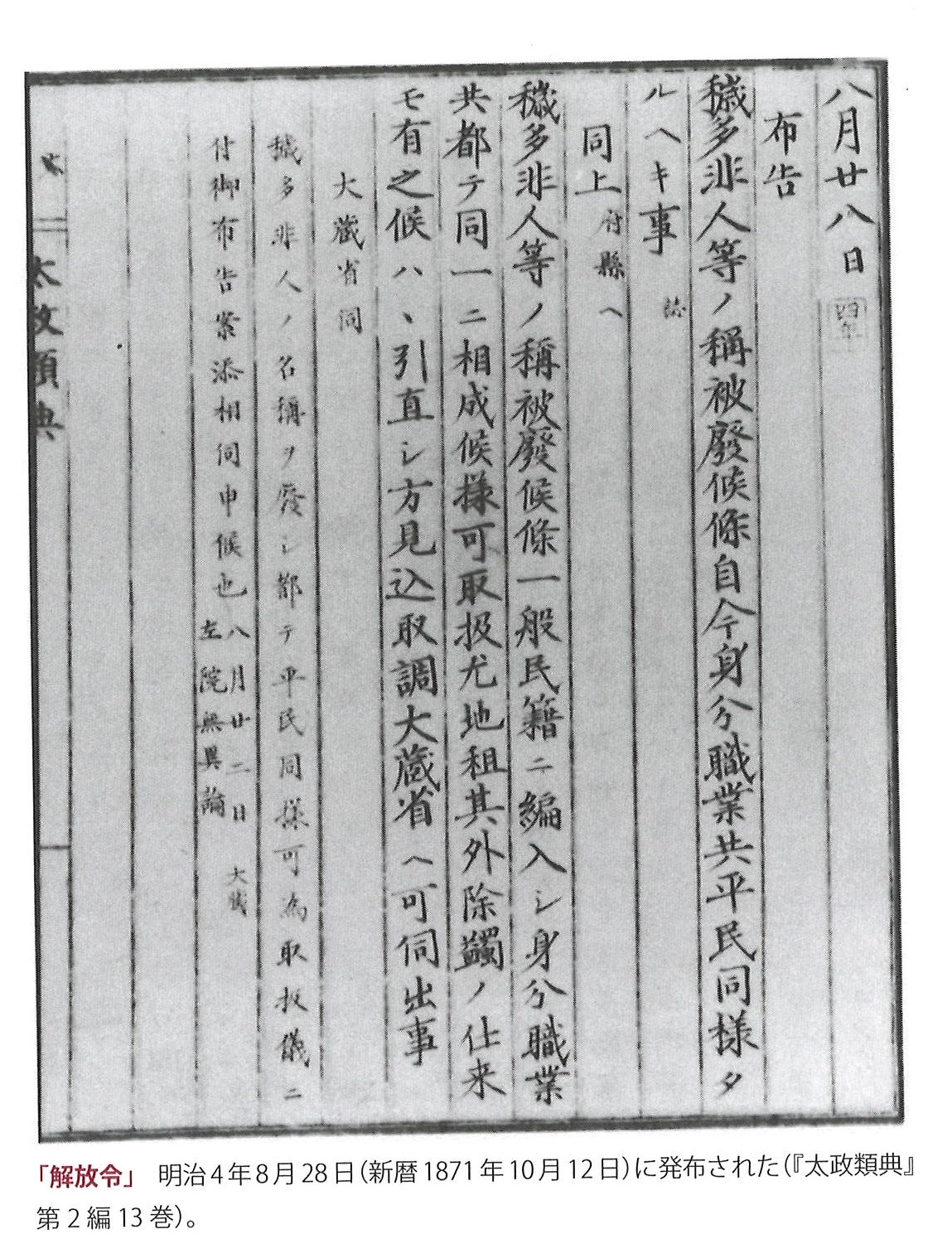 1871年8月 「解放令」(太政官布告)