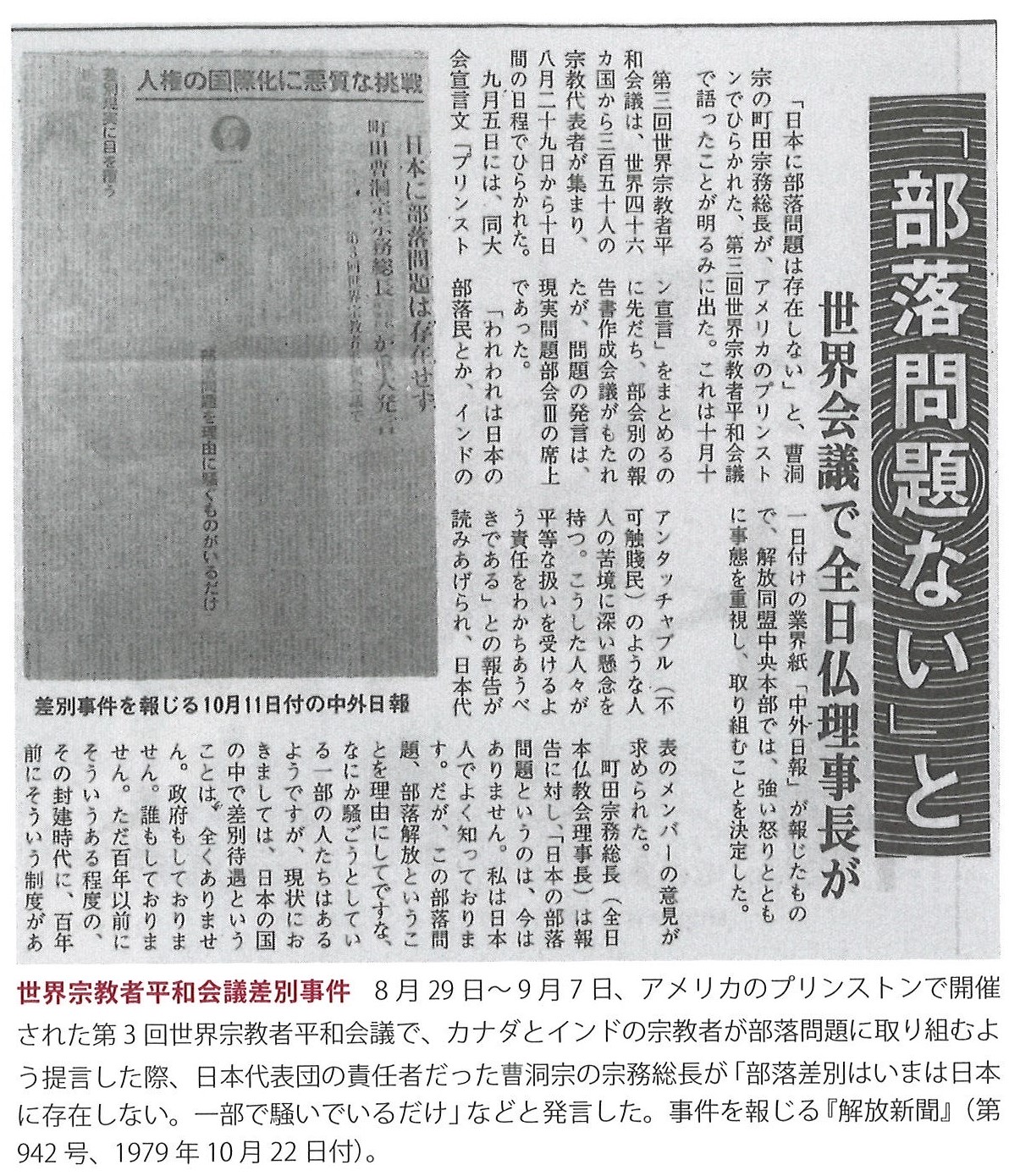 1979年8月 第3回世界宗教者平和会議で町田宗夫曹洞宗宗務総長・全日本仏教会理事長が「日本に部落問題はない」と発言…事件を報じる解放新聞